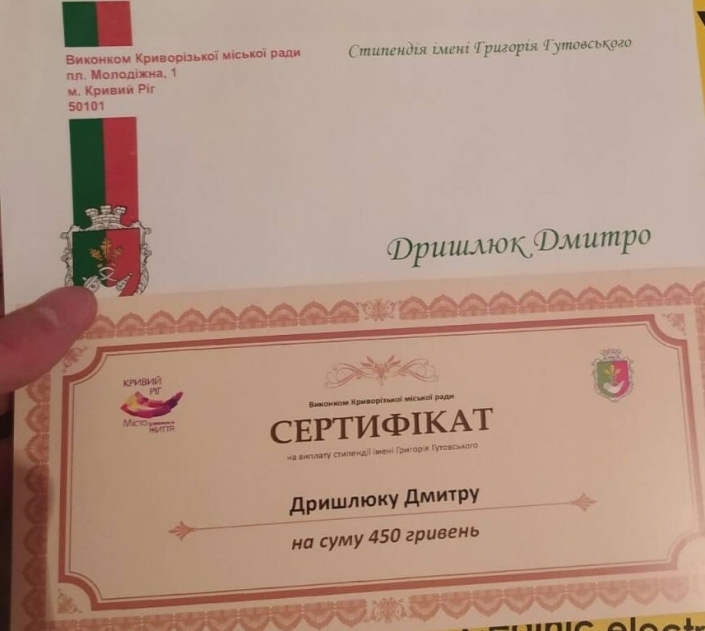 Учень нашого ліцею за спеціальністю «Оператор з обробки інформації та програмного забезпечення» Дмитро Дришлюк отримав стипендію ім. Григорія Гутовського. Дмитро зайняв ІІ місце в обласному конкурсі з Web-дизайну, він учасник конкурсів фахової майстерності. Здобуті теоретичні знання інтенсивно вдосконалює на практиці, наприклад, при розробці мобільного додатка доповненої реальності «AR KPGTL». Ми вітаємо Дмитра з почесною нагородою!